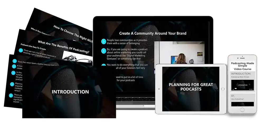 Our video course walks you through the planning stages of monetization. Learn to pick the right niche, choose the perfect equipment, and record professional podcasts. We have chapters on Podcast Hosting and Distribution, and growing your podcast listener numbers. You don't have to know everything to get started; you need Podcasting Made Simple.