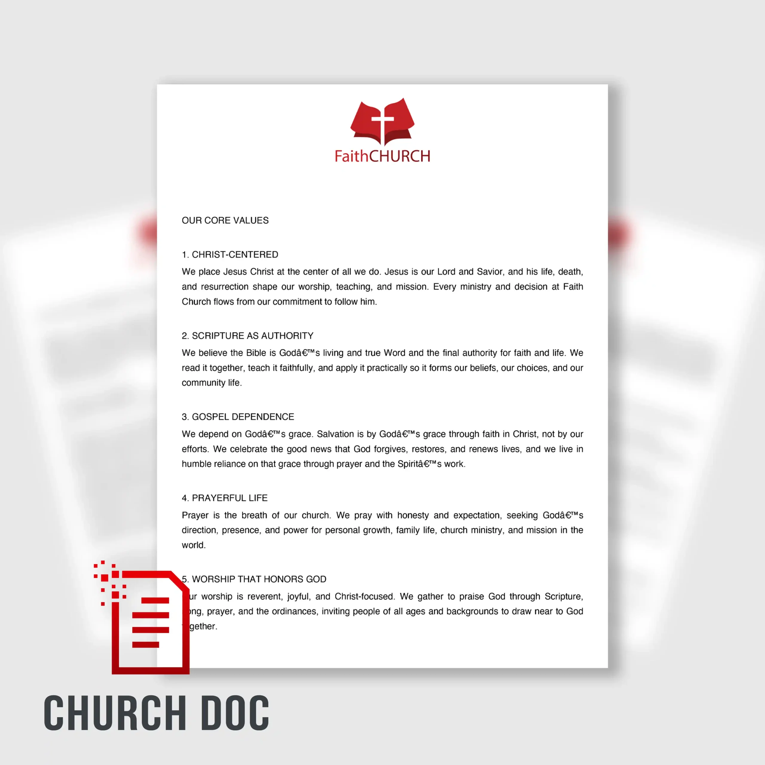 Church Doc is the simplest, fastest way for ministries to create professional, customized church documents in seconds. Whether you need a Statement of Faith, Bylaws, an “About Us” page, a Child Care Policy, or any other ministry document, Church Doc uses powerful AI to generate clear, polished, faith-aligned writing tailored to your church’s name, denomination, voice, and mission. Just enter a few details, upload your logo, and download a ready-to-use PDF—perfect for new church plants, growing ministries, and leaders who want excellence without the stress. With Church Doc, you can focus more on people and ministry while we handle the paperwork.